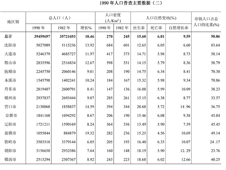 全省1989年7月1日至1990年6月30日的人口自然增长率按由低向高的顺序排列,低于10‰的有沈阳市、辽阳市、鞍山市、抚顺市、大连市、锦州市、本溪市、阜新市,其中沈阳市的自然增长率最低,为6.60‰,其他6个市的自然增长率均在10‰至14.99之间,他们是铁岭市、丹东市、盘锦市、朝阳市、锦西市和营口市。